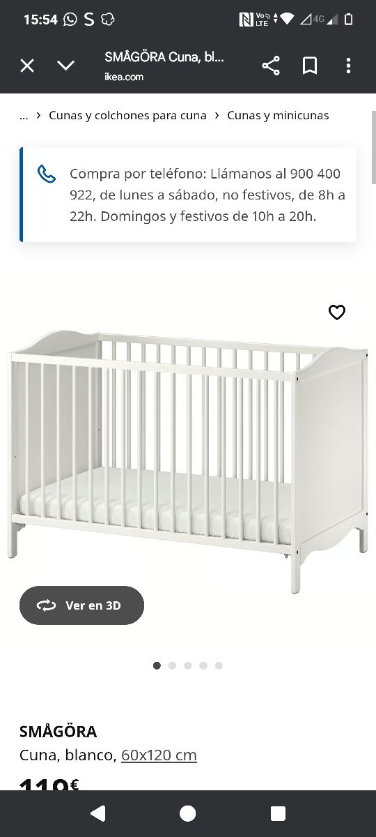 Cuna SMÅGÖRA de Ikea, color blanco, en perfecto estado. Ideal para bebés. - Medidas: 60x120 cm - Incluye: Cuna SMÅGÖRA