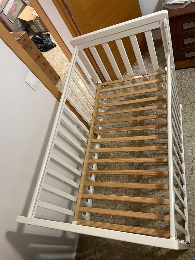 Cuna trama. de barrote plano y blanco. Esta en muy buen estado. Solo tiene un golpecito en una esquina. Una barandilla es abatible, se puede poner en ambos lados. Yo la he usado sin baranda para colecho. Se incluyen instrucciones de motaje y las ruedas practicamente nuevas.