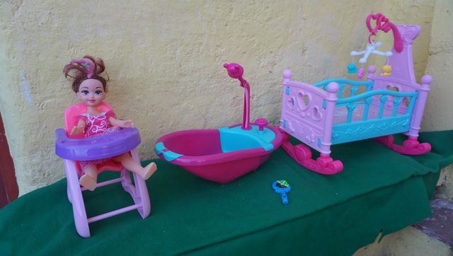 Detalles del producto Conjunto de juguetes para muñecas en buen estado. Incluye una cuna mecedora con móvil, una trona y una bañera. Perfectos para el juego simbólico. - Cuna con movil . - Trona para muñecas. - Bañera para muñecas.Lote de cuna 37cm por 30 ancho al balancin y 40 cm alto al movil le falta un muñequito , trona 18x16x 25 cm alto, bañera 40x21x12cm muñeca 32 cm, sonajero, buen estado, entrego en mano o envío, tengo mas cosas a la venta, mirar mi perfil, gracias