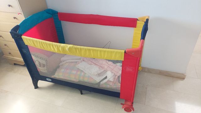 Detalles del productoCuna de viaje para bebé, ideal para viajes o uso diario. Está en buen estado, con algunos signos normales de uso.
