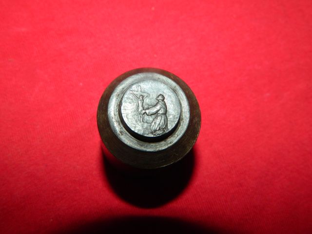 Detalles del productoTroquel o cuño de acero con una figura religiosa.