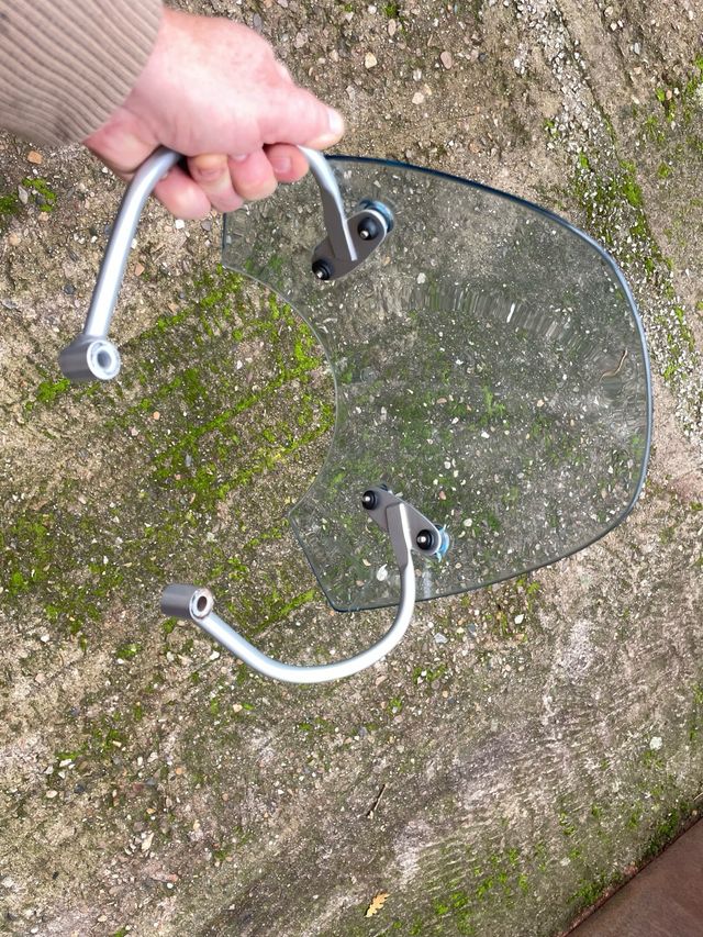 Cúpula de parabrisas para motocicleta BMW. Fabricada en material transparente con no soportes metálicos. - Diseño curvo. - Soportes de metal plateado.