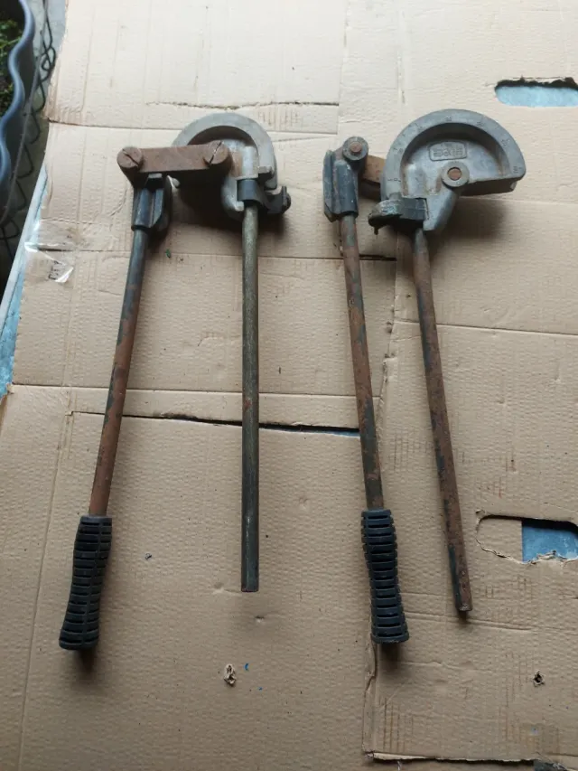 Herramientas manuales para curvar tubos. - Fabricadas en metal resistente. - Mangos con empuñadura de goma negra. - Diseño robusto para un uso prolongado.