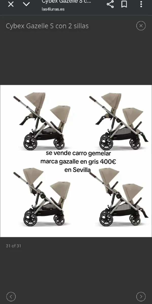 Detalles del productoCarro gemelar Cybex Gazelle en color gris, perfecto para dos niños. Se vende en Sevilla.