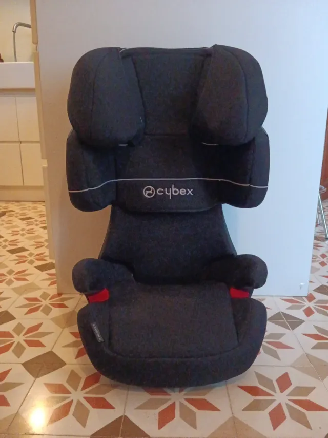 Silla de coche Cybex Solution X, diseñada para ofrecer seguridad y comodidad. - Tapicería oscura. - Reposacabezas ajustable. - Protección lateral reforzada.