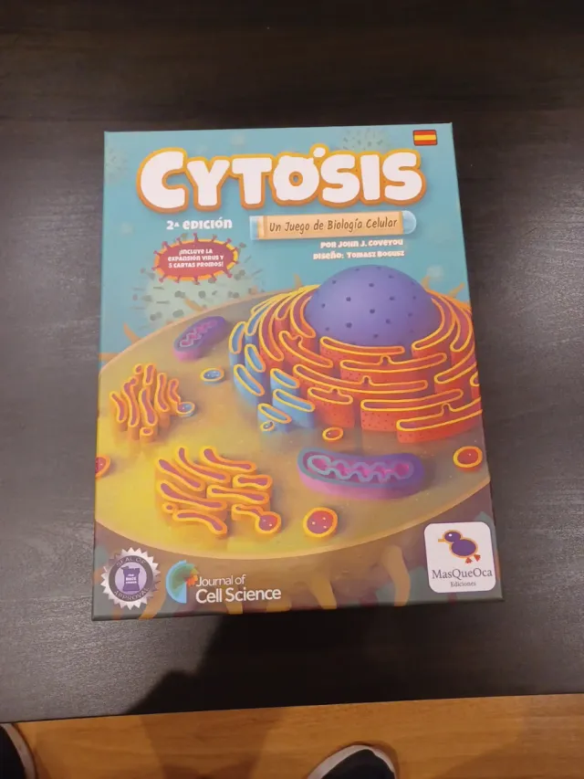 Detalles del productoJuego de mesa Cytosis, segunda edición, sobre biología celular. Incluye la expansión Virus T y 5 cartas promo.