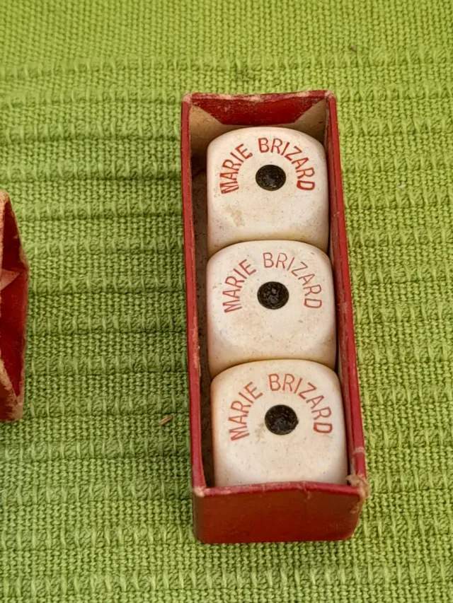 Conjunto de tres dados con publicidad de la marca Marie Brizard. En caja original.