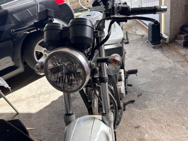 la moto tuvo una caida y esta un poco rascada en el foco y el retrovisor lleva 4 meses parada pero enciende perfectamente tiene roto el soporte del pedal de freno a causa de la caida se podria vender con el arreglado sin problema. se vende por 1200€ negociables
