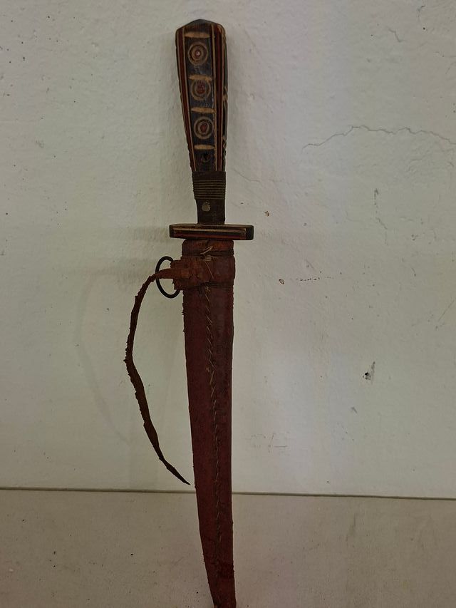 Daga antigua con hoja grabada por una cara,mango de madera con dibujos tallados y pintados y funda de cuero. 34 cm de longitud