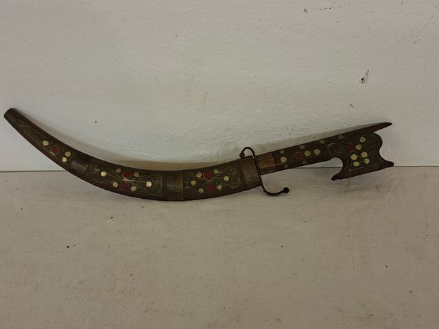 Detalles del productoDaga antigua con la hoja curva y grabada por las dos caras. Mango de madera con dibujos de taracea de madera y metal. La funda,también de madera, tiene anillos de latón y dibujos con incrustaciones de latón, nacar y madera. 43 cm de longitud