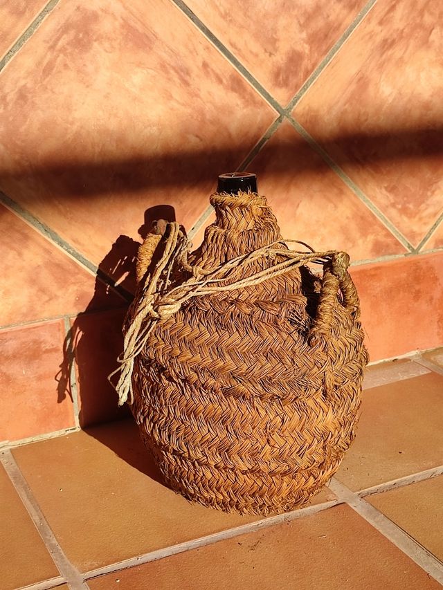 Detalles del productoDamajuana antigua forrada con esparto cosido a medida, en buen estado, sin tapón, con asas y posibilidad de colgar.