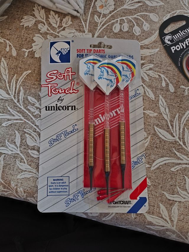 Detalles del productoDardos de punta blanda Unicorn Soft Touch, en su paquete original. Son tres dardos con diseño de unicornio. Ideales para juegos electrónicos. Se aprecian en buen estado. - Dardos de punta suave. - Diseño de unicornio. - Para juegos electrónicos. - Tres dardos incluidos. HAGO ENVIOS