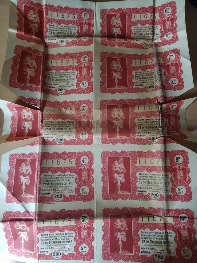 Detalles del productoDécimos de lotería nacional de Navidad del sorteo del 22 de diciembre de 1953. En Madrid.