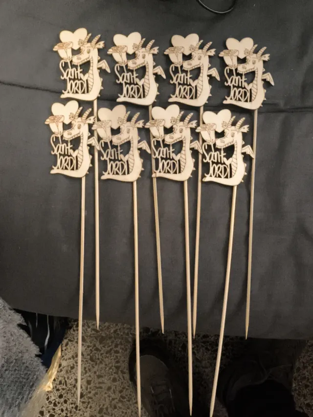 Detalles del productoLote de 8 adornos de madera para Sant Jordi. Cada uno representa un dragón con una rosa y el texto Sant Jordi.