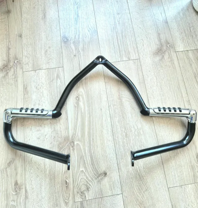 Detalles del productoDefensa delantera para moto Harley Davidson Softail. Fabricada en acero robusto con acabado negro brillante y detalles cromados.