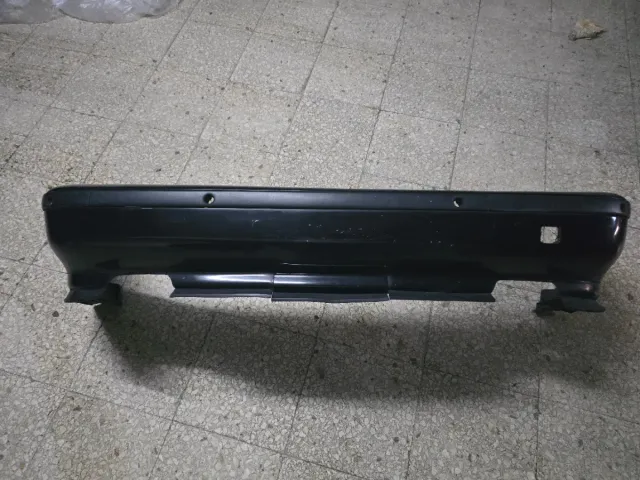 Detalles del productoDefensa trasera para BMW E39 Berlina. Pieza de plástico negro, con tapa original para gancho, agujeros parktronic y huecos doble salida escape