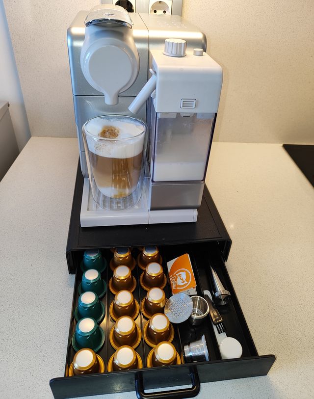 Detalles del producto¡1 botón de capuchino! Comprada en 2022. Dic. Vendo esta cafetera De'Longhi Nespresso Lattissima Touch POD, como nueva sin marcas de uso + caja original. Además, ofrecemos una bandeja deslizable para el soporte del POD, además del kit de cápsulas de metal recargables que usamos todos los días, funciona completamente. El motivo de la venta es que compramos una máquina aún más grande :) Hace un gran café desde cualquier cápsula Nespresso, botones programables y 6 preajustes, 1 clic latte macciato. Vendiendo todos juntos solamente. Mira esa hermosa bebida....