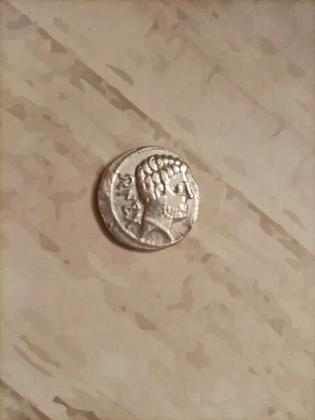 Moneda antigua de plata, un denario de Baskunes. - Diseño detallado de cabeza. - Símbolos y escritura en relieve.
