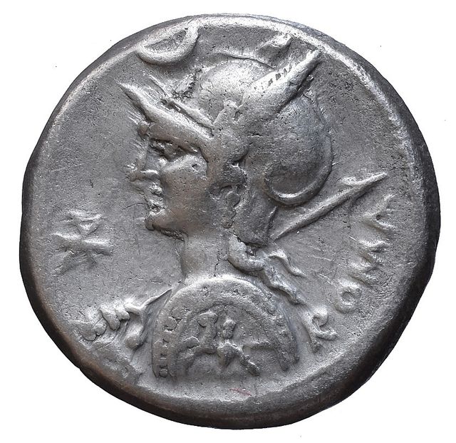 A/ Cabeza de Roma con escudo y lanza sobre el hombro