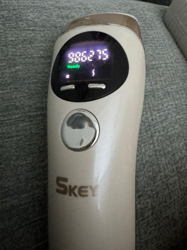 Depiladora láser SKEY con pantalla digital y función Ready. - Pantalla digital que muestra 996275. - Indicador Ready para uso. - Diseño ergonómico.