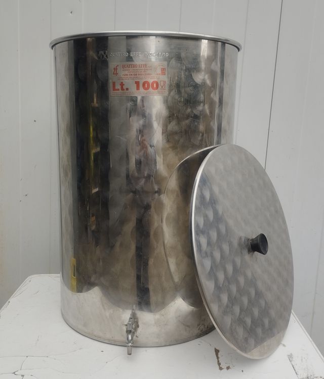 Detalles del productoDepósito de Acero Inoxidable de uso alimentario 18/10 de 100 litros de capacidad con acabado externo a rosetas, con grifo y una tapa externa antipolvo.