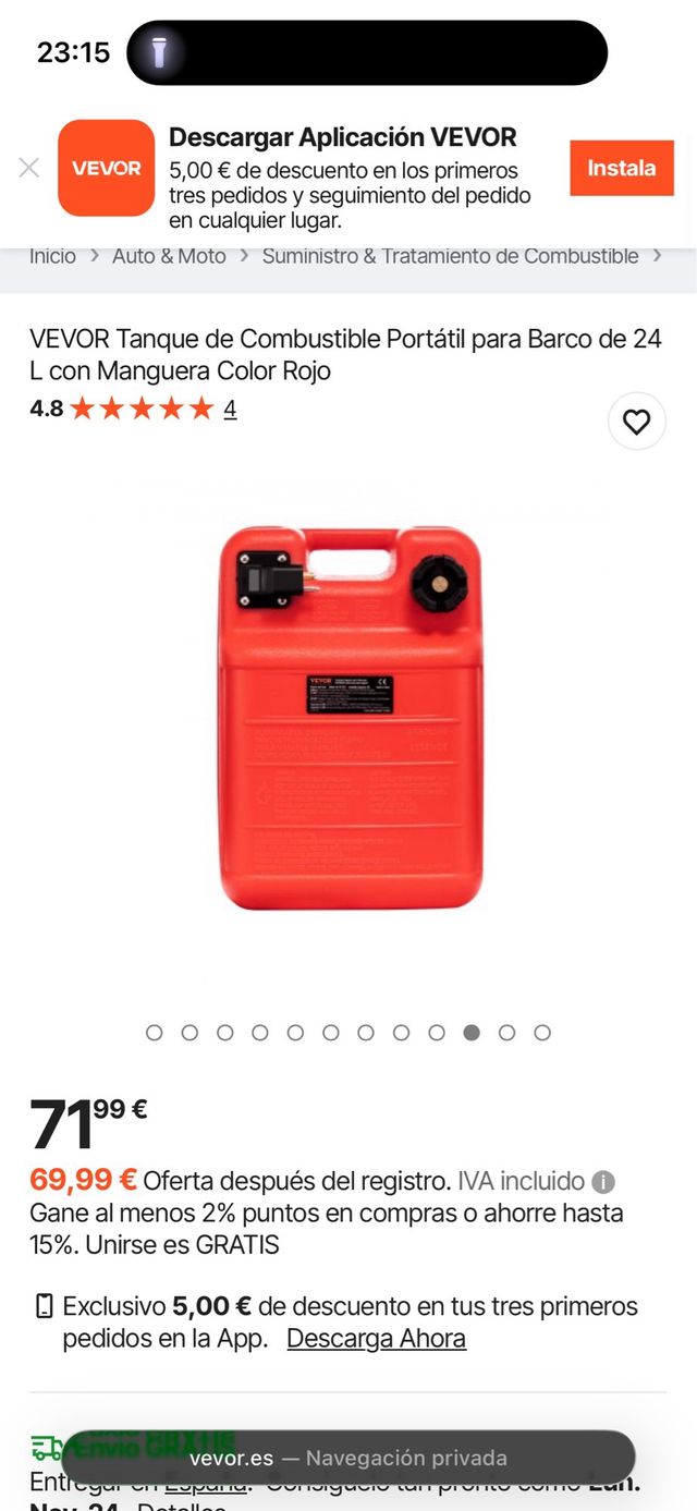 Depósito de combustible portátil VEVOR para barco. - Capacidad de 24 litros. - Color rojo. - Incluye manguera.