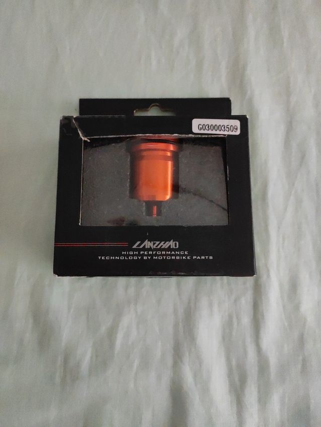 Detalles del productoDepósito para líquido de frenos o embrague de motocicleta con soporte, en color naranja.
