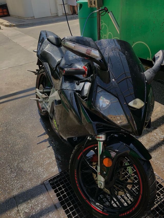 Moto Derbi GPR en color negro. - Diseño deportivo. - Ruedas con detalles rojos. - Espejos retrovisores integrados.