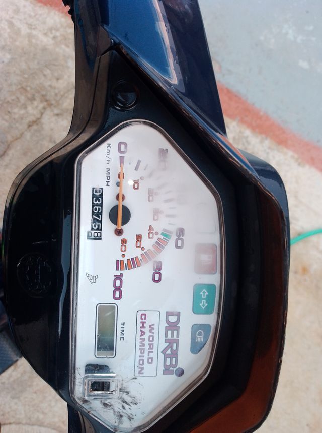 Panel de instrumentos para Derbi Variante Start. Muestra la velocidad en Km/h y MPH, junto con el kilometraje total. - Cuentakilómetros: 036758. -