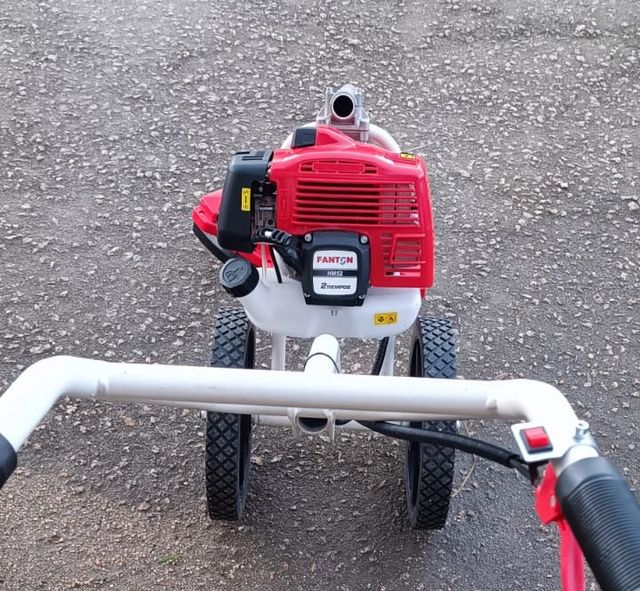 Desbrozadora a gasolina Fanton HM52 con motor. - Color rojo y blanco. - Ruedas para facilitar el transporte. - Cabezal de corte con hilos.