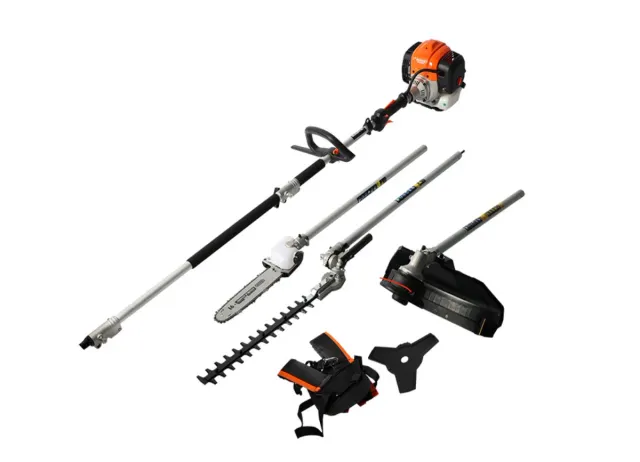 Detalles del productoConjunto de desbrozadora multifunción con varios accesorios para diferentes tareas de jardinería.