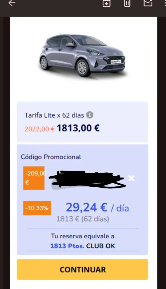 Detalles del productoAprovecha este descuento en la tarifa Lite de Okmobility que tengo que no lo voy a poder usar y si alguien lo necesito lo puedo bajar a 175 el caso es recuperar algo del dinero