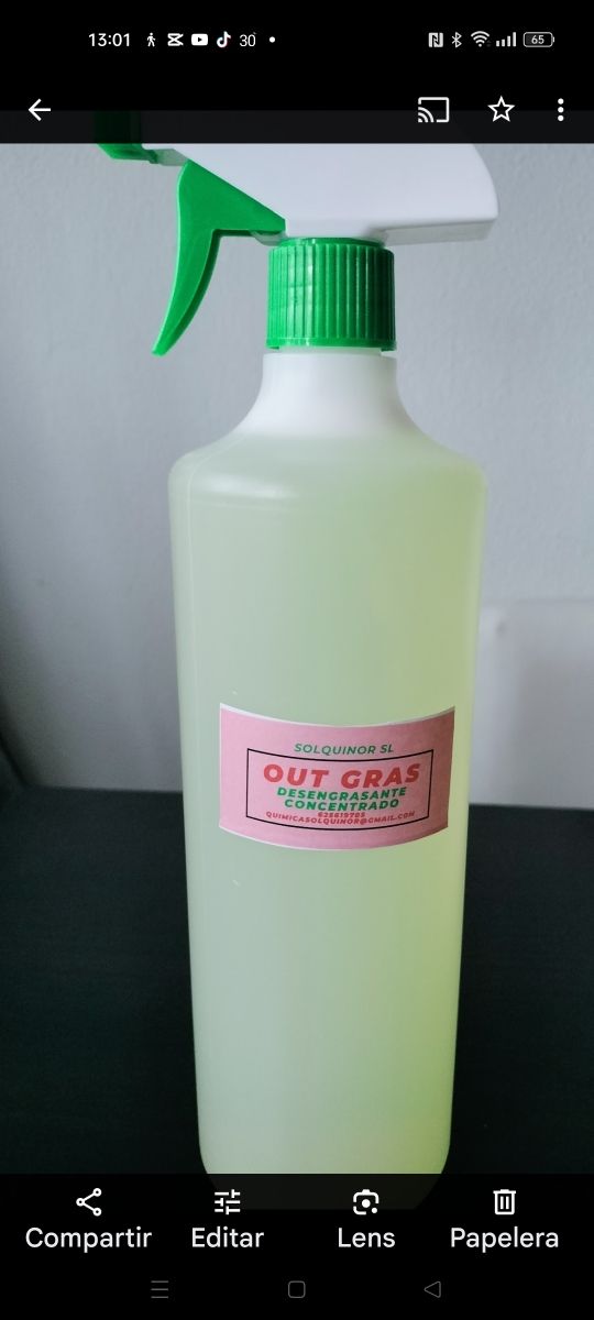 Químico desengrasante Out Gras, concentrado. Ideal para horno, vitrocerámica y microondas. - Producto de la marca Solquinor SL. - Se presenta en un envase de plástico con pulverizador. - El líquido es de color amarillo claro.