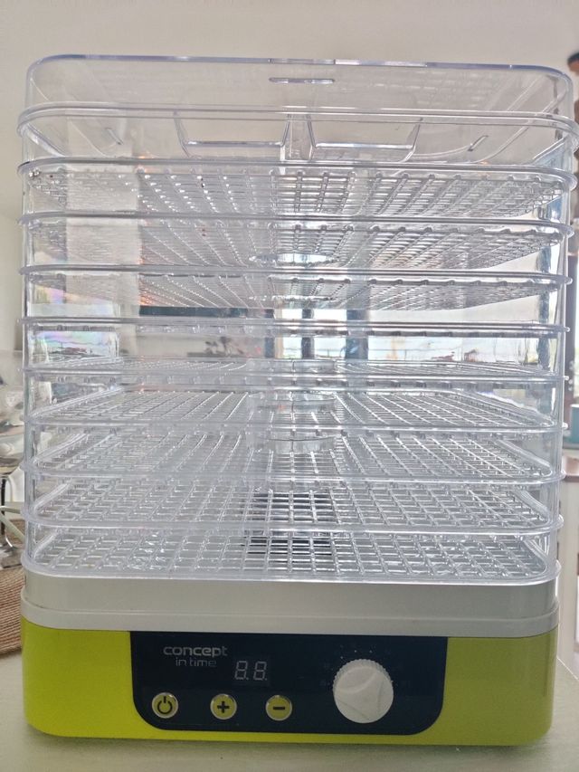Deshidratador de alimentos transparente con varias bandejas. - Diseño apilable. - Material plástico resistente. - Bandejas con rejilla para ventilación.