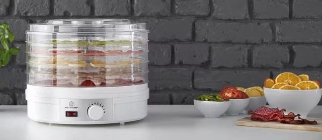 Detalles del productoDeshidratadora eléctrica MisterChef, ideal para secar frutas, verduras y carnes. Su diseño transparente permite ver el proceso.