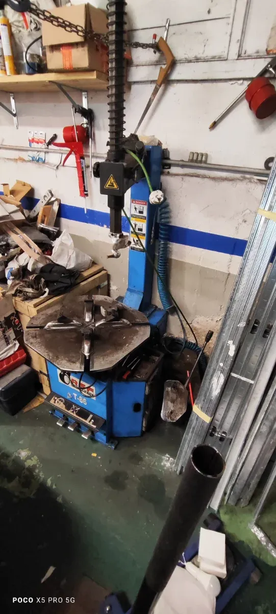 Máquina desmontadora de neumáticos para taller. - Color azul. - Base giratoria. - Brazo vertical con sistema de montaje/desmontaje.