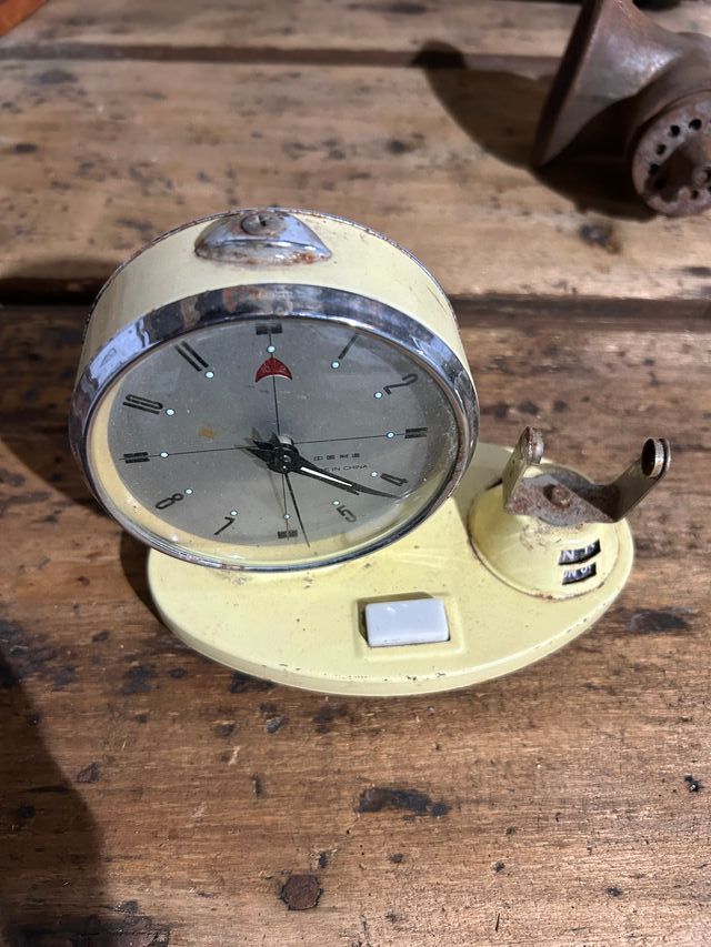 Despertador antiguo sobre una base de baquelita. Le faltan algunas piezas