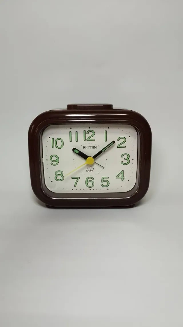 Detalles del productoDespertador rhythm de los años 90. Color marrón con esfera blanca. Fabricado en Japón. Funciona con una pila tipo C. Suena bien la alarma y da bien la hora. Medidas: 12x10x6 cm.