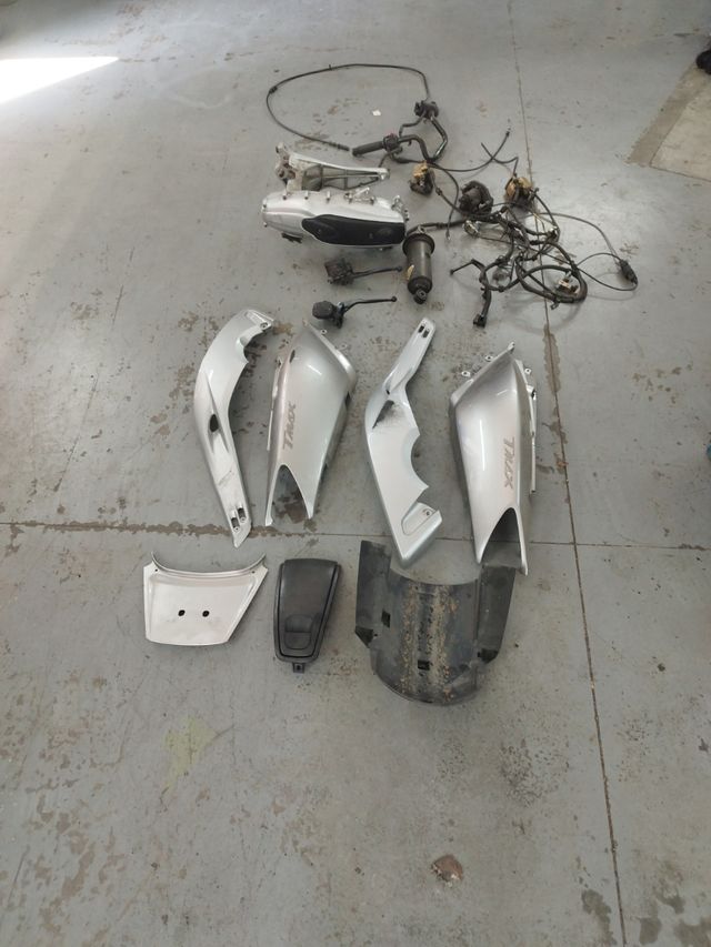Piezas de despiece para Yamaha T-MAX. - Carrocería plateada. - Motor. - Manillar. - Guardabarros. - Amortiguador central -bomba frno y pinzas Precio negociable