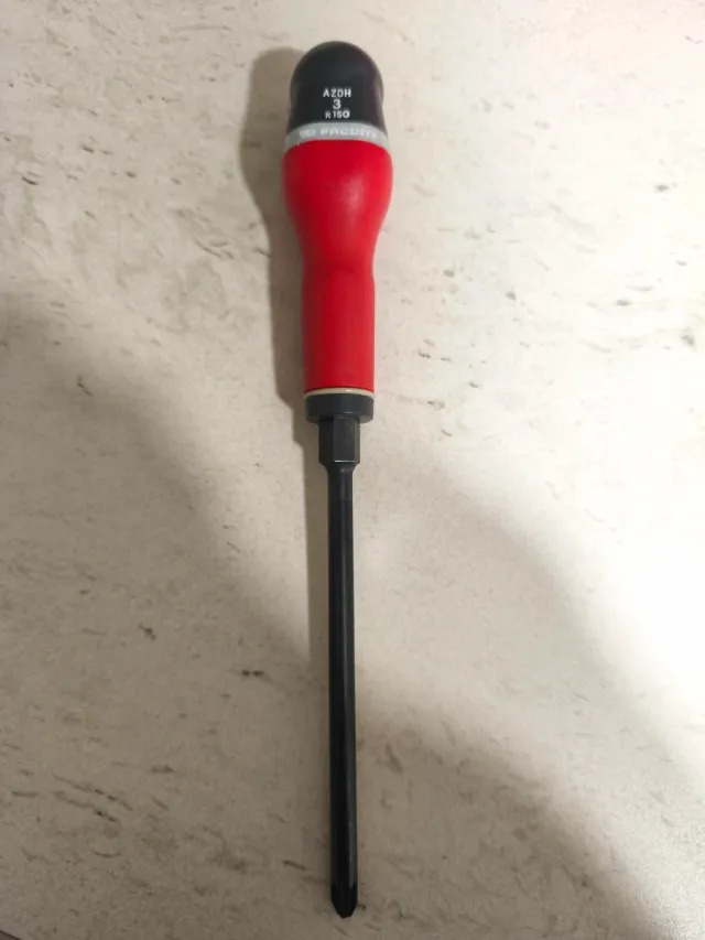 Destornillador de la marca Facom. - Modelo AZDH3. - Mango ergonómico de color rojo y negro. - Varilla metálica de color negro.