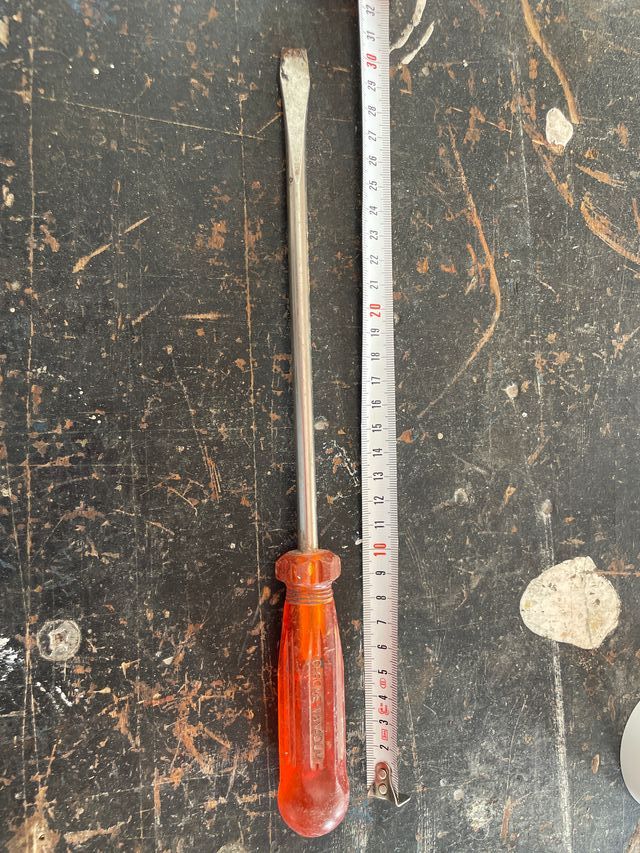 Detalles del productoDestornillador plano de gran tamaño, con una longitud total de 30 cm. Mango de color naranja translúcido.