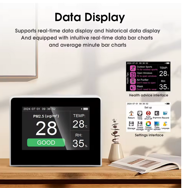 Respuesta precisa y rápida: equipado con sensor láser de partículas de polvo para lecturas rápidas y precisas de PM2.5 y un sensor de dióxido de carbono con un tiempo de respuesta de 2 segund