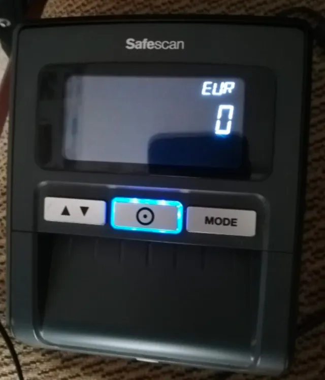 Detector de billetes falsos Safescan. - Pantalla digital. - Indicador de moneda EUR. - Botones de navegación y modo.
