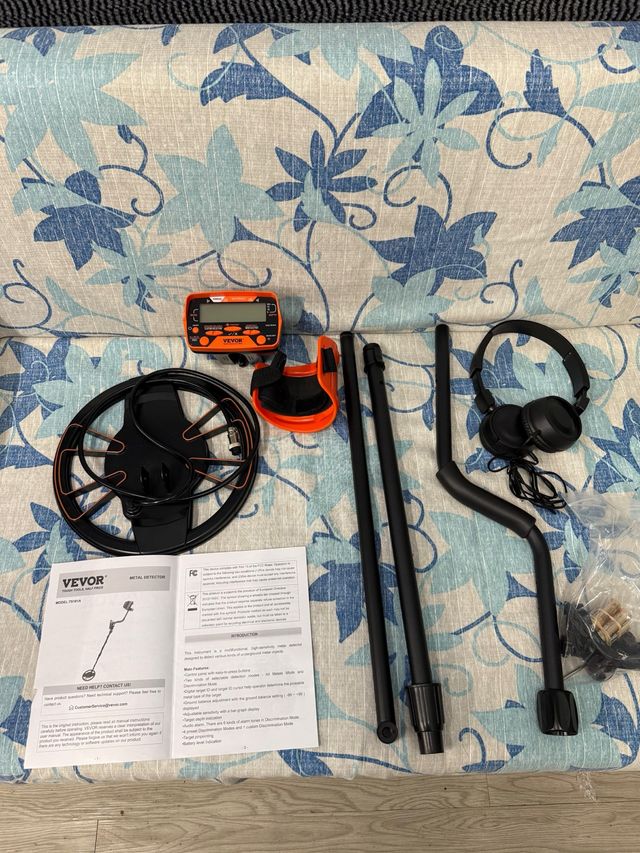 Detector de metales VEVOR con pantalla digital y auriculares. - Bobina de búsqueda. - Eje ajustable. - Manual de usuario.