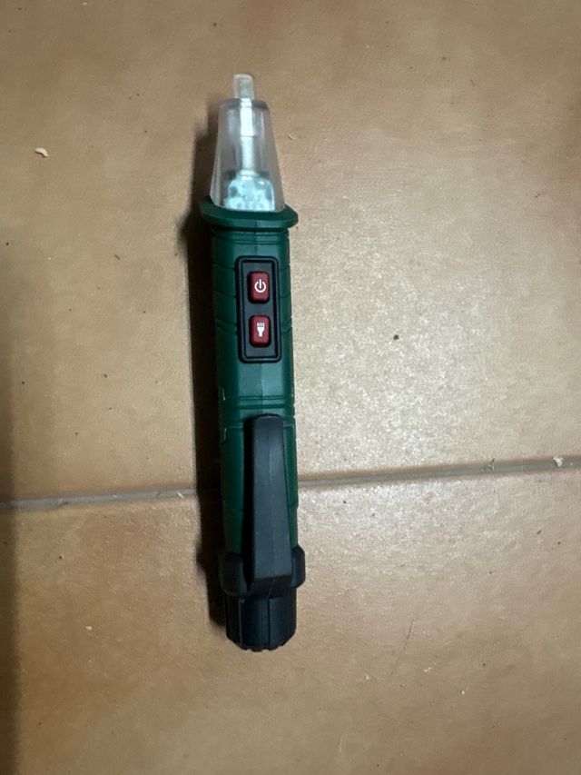 Herramienta para detectar tensión eléctrica. Su diseño es alargado y ergonómico. - Cuerpo de plástico verde y negro. - Botones de control rojos. - Punta transparente.