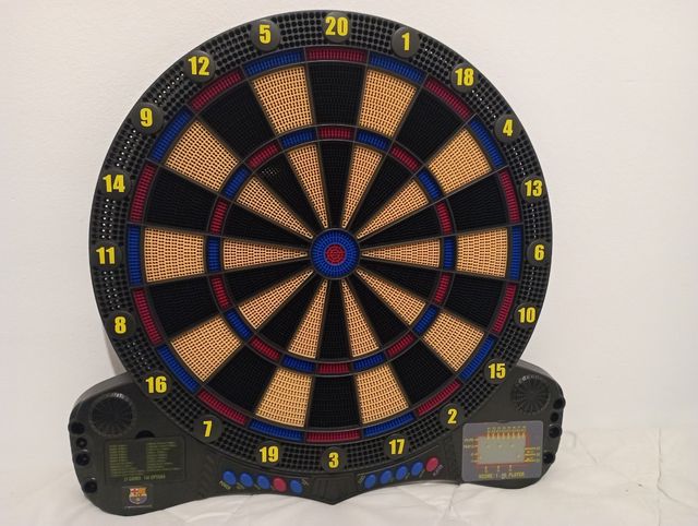 Diana electrónica del Barça, la caja que la contiene está un poco rota, sin embargo la diana y los dardos están por estrenar.