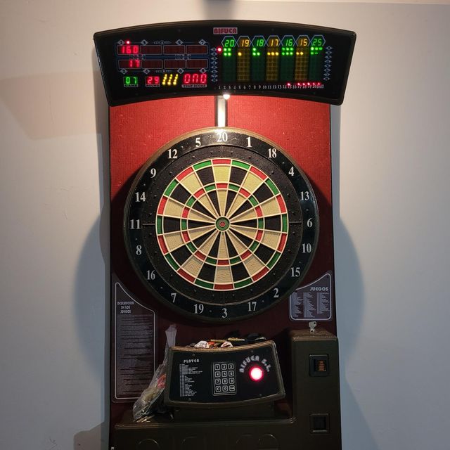 Se vende diana electrónica Bifuca con marcador digital con fallo eléctrico, no arranca. - Marcador digital con puntuación. - Diseño clásico de diana. - Incluye dardos.