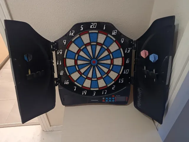Detalles del productoDiana electrónica con puertas laterales para guardar dardos y accesorios. Incluye dos juegos de dardos.