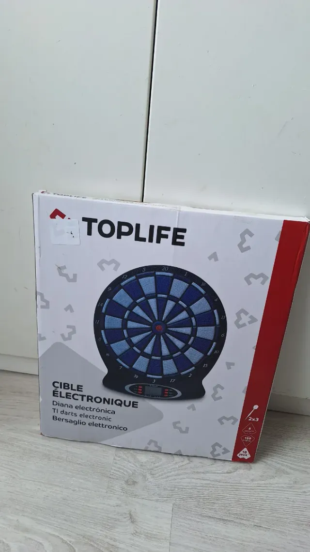 Diana electrónica de la marca TOPLIFE. - Diseño moderno en azul y negro. - Pantalla digital integrada. - Ideal para juegos de dardos electrónicos.