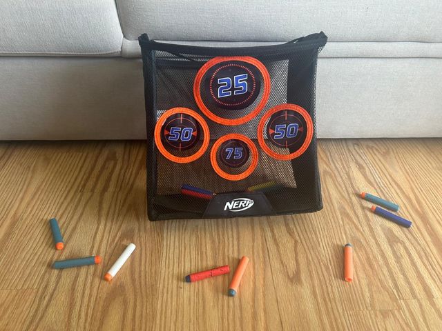 Diana portátil de la marca Nerf con varios objetivos numerados para practicar. - Incluye dardos de diferentes colores.